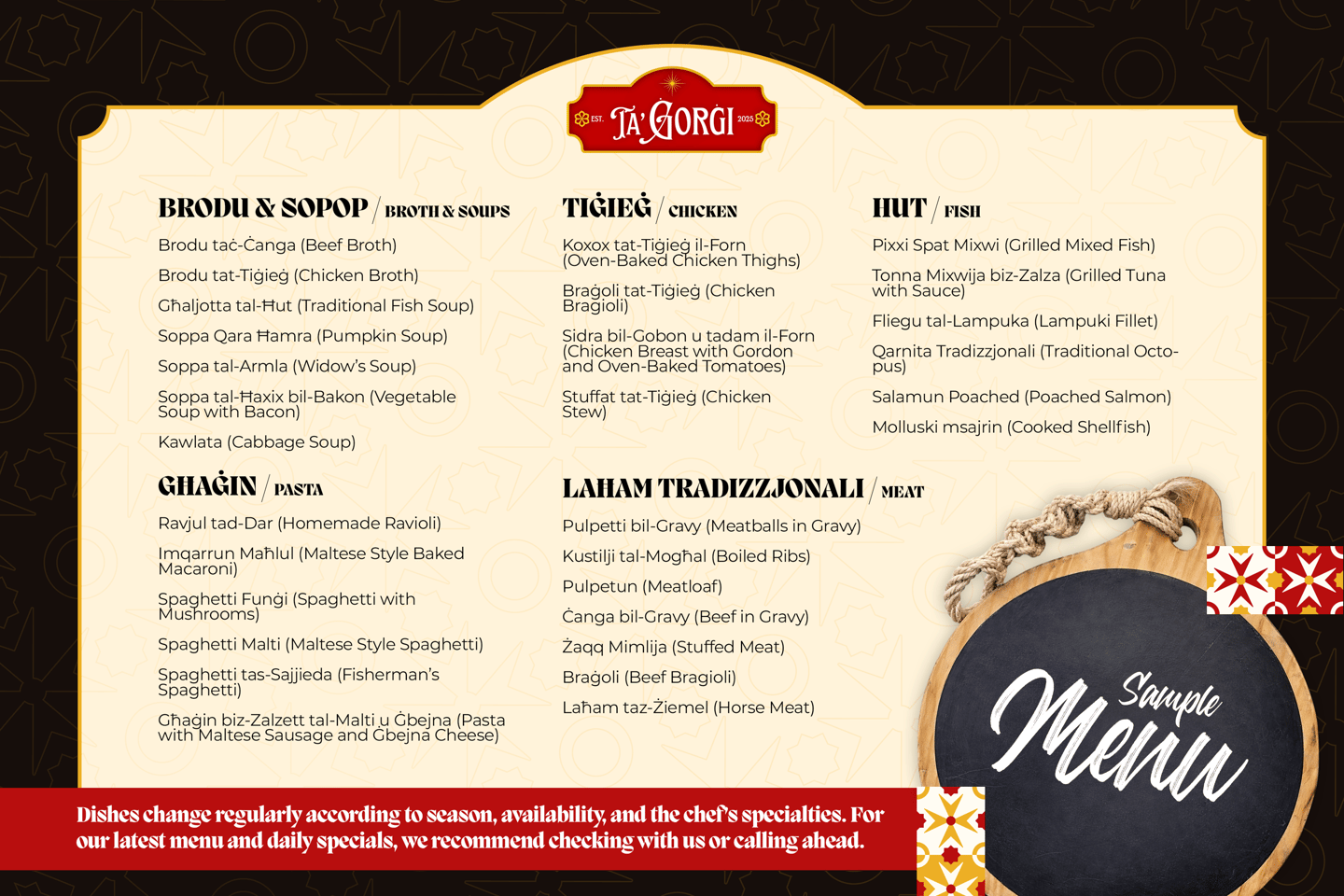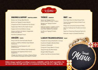Our menu is a sample of what we offer at Ta’ Ġorġi. Dishes change regularly according to season, availability, and the chef’s specialties. For our latest menu and daily specials, we recommend checking with us or calling ahead.
